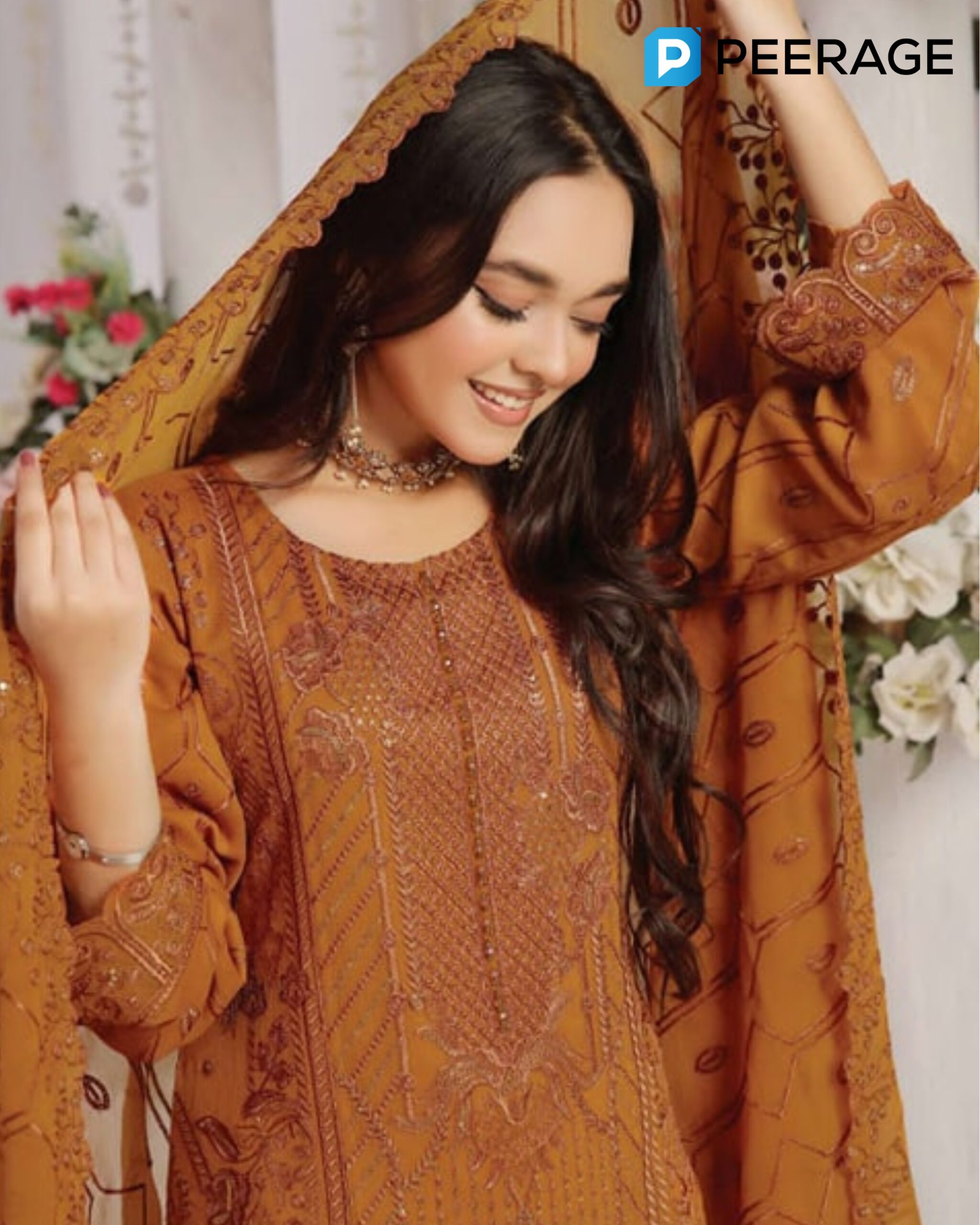 Drape yourself in charm with this mustard chiffon masterpiece, delicately embroidered to perfection. The embroidered chiffon shirt pairs effortlessly with a matching embroidered chiffon dupatta, while the raw silk trouser adds a touch of sophistication. A graceful blend of elegance and comfort for every occasion.
