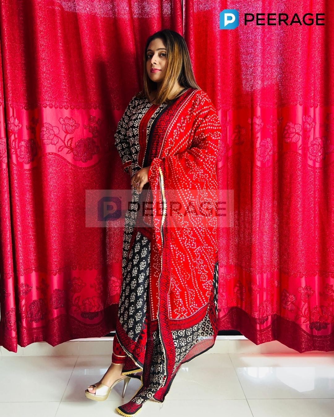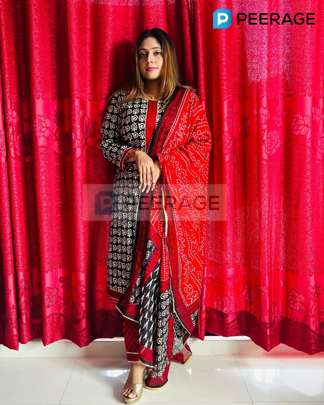 Add a touch of charm to your everyday style with this black and white printed cotton kameez, paired with a red cotton pant and a black-and-red printed cotton dupatta. A classic regular-wear outfit that’s both easy and stylish.