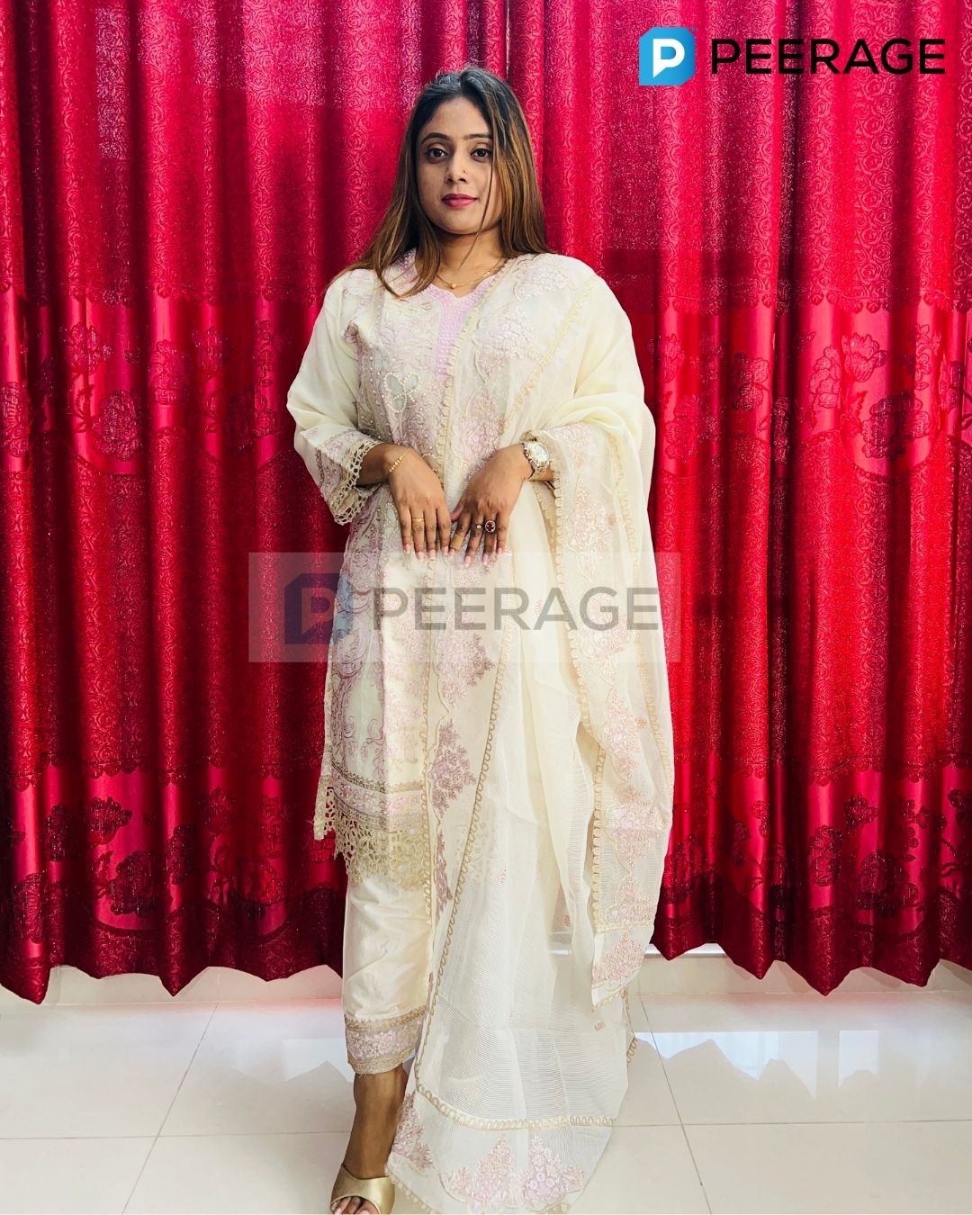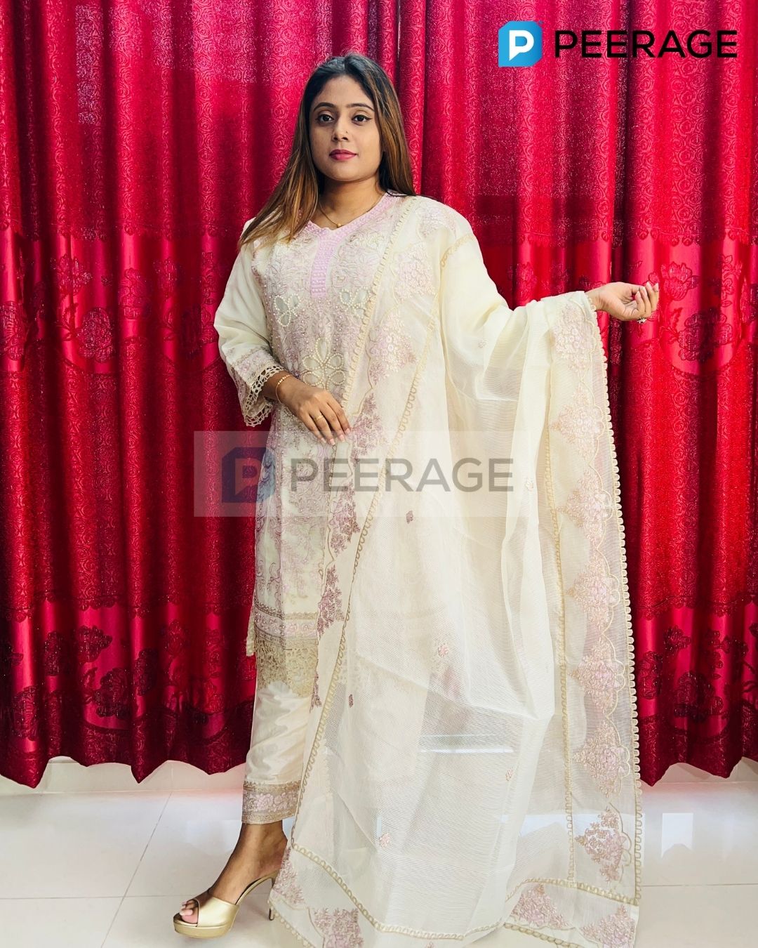 Radiate subtle charm with this off-white and light lavender Kota ensemble, featuring a stitched Kota kameez adorned with all-over embroidery, paired with a santoon inner, a graceful Kota dupatta, and a santoon pant. A refined blend of elegance and sophistication for a timeless look.