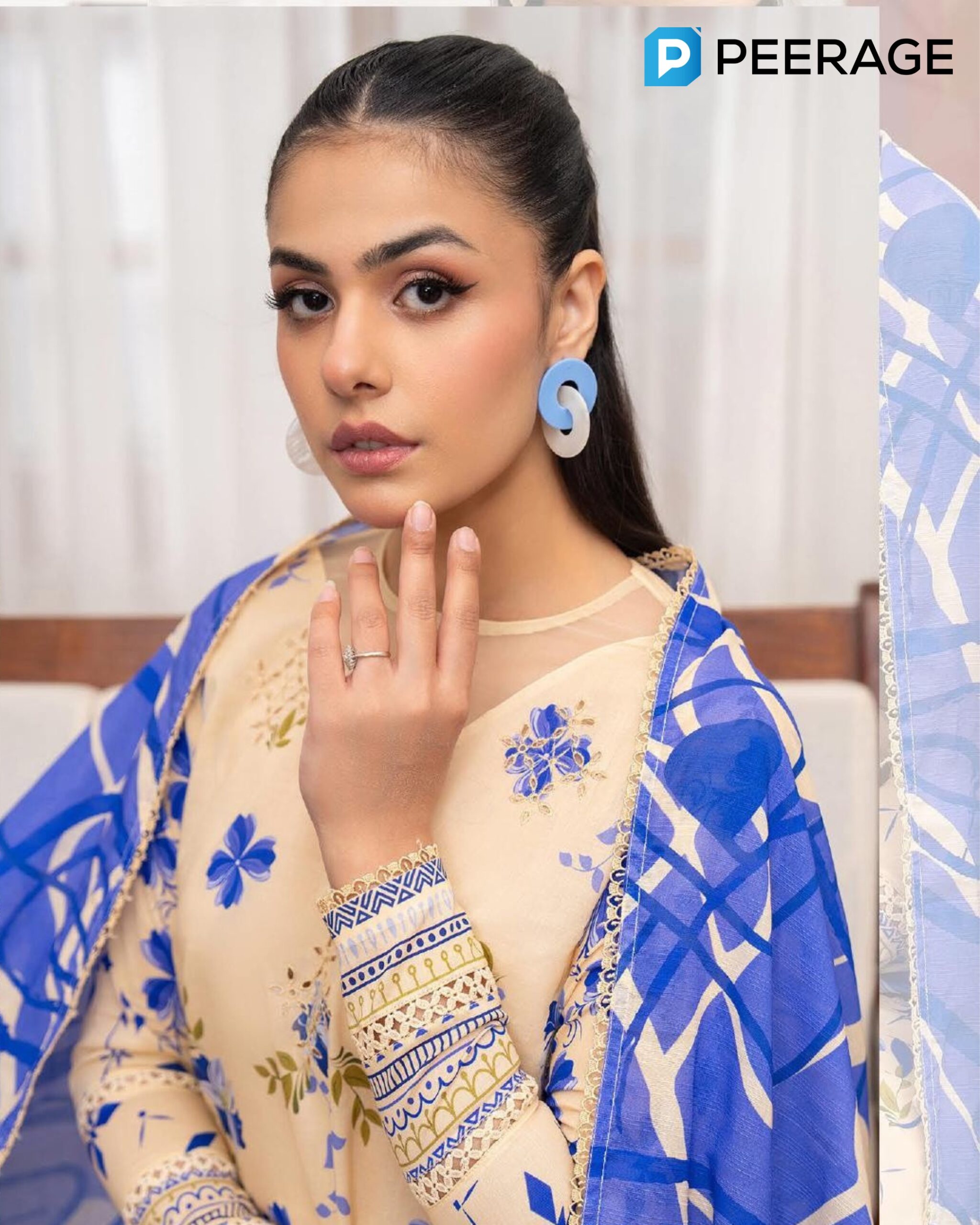 Grace meets sophistication in this beige kameez with delicate blue prints, paired beautifully with a striking blue stripe lawn dupatta. The ensemble features a digital printed embroidered front, sleeves, and back, finished with organza embroidered lace for added elegance. Complemented by a dyed cambric trouser, this outfit is the perfect balance of subtle charm and vibrant appeal.