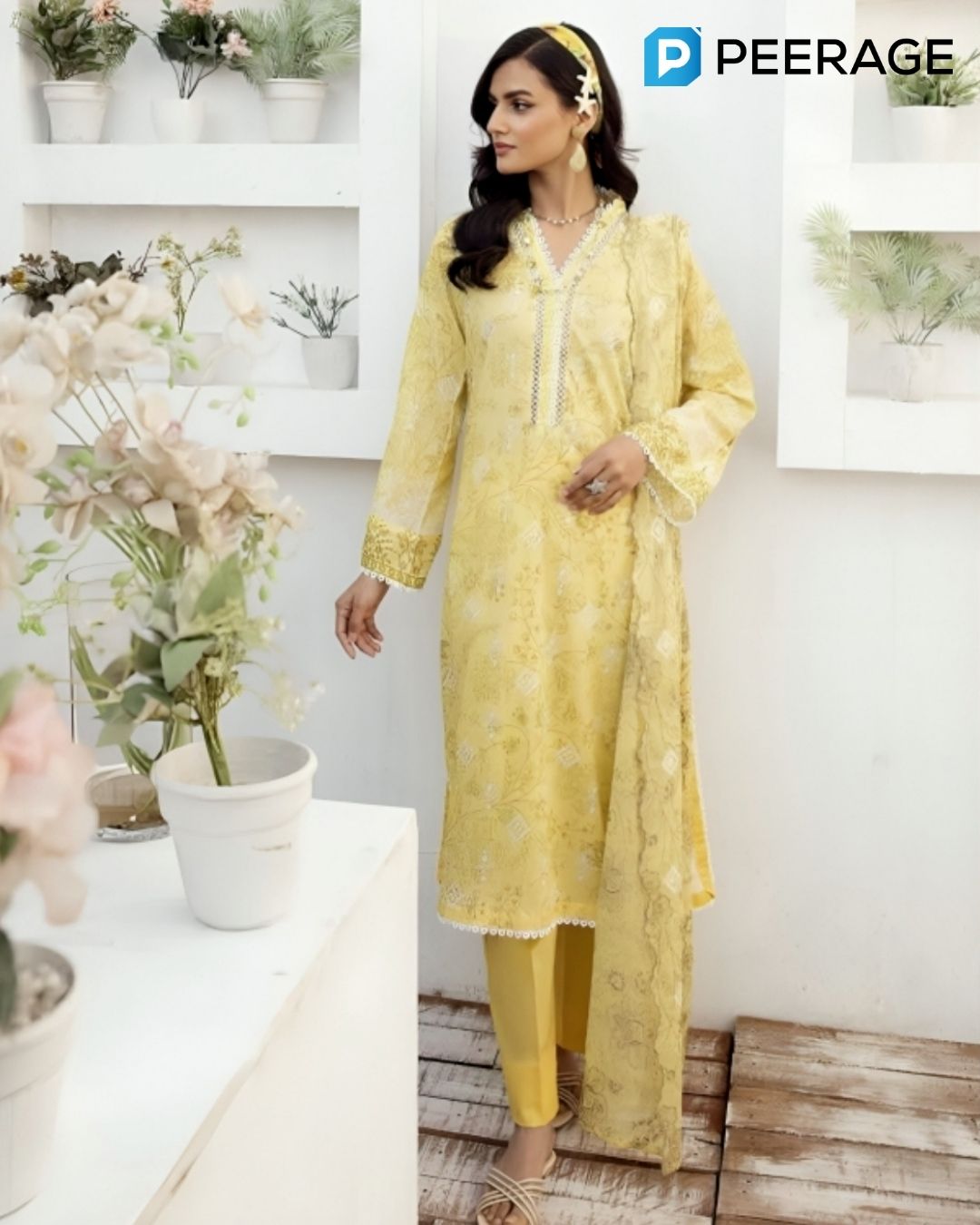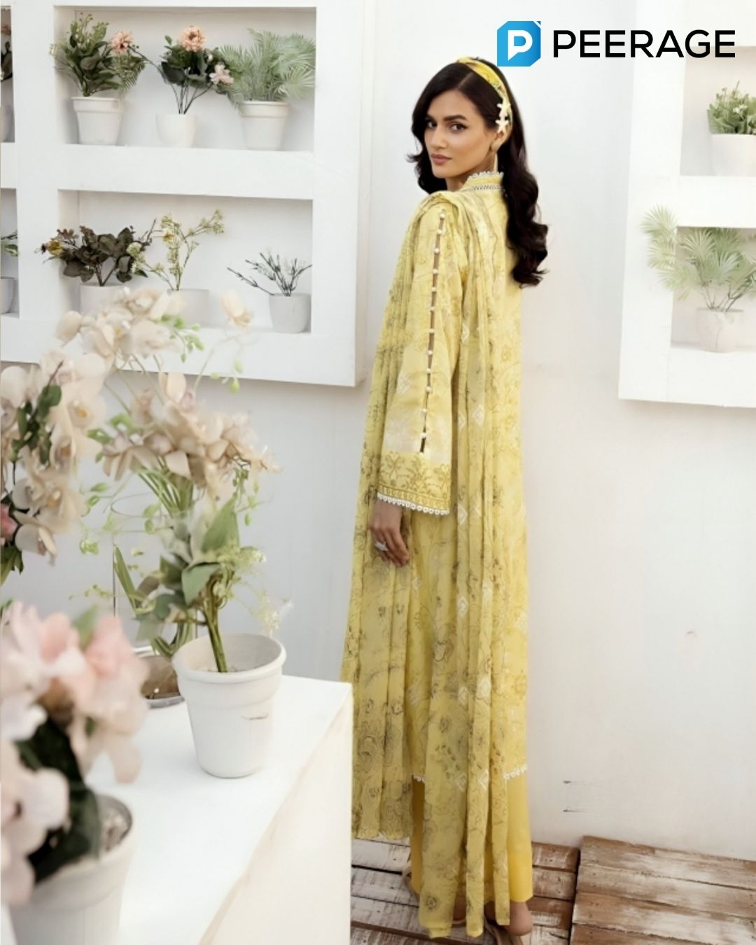 Brighten your style with this premium digital printed lawn dress in a radiant yellow shade. Paired with a delicately embroidered chiffon dupatta and a breathable cotton pant, it offers both comfort and elegance.