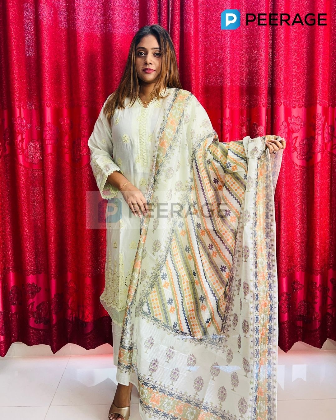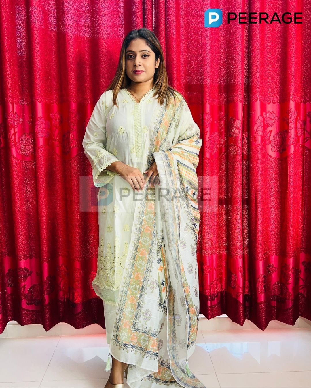 Bring freshness to your style with this light lemon cotton outfit, featuring a stitched kameez with boring work and delicate embroidery. The look is enhanced with a printed semi-organza dupatta and a classic cotton pant, making it a perfect blend of elegance and comfort for everyday sophistication.