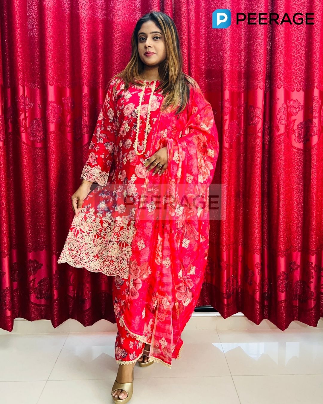 Turn heads with this red floral printed cotton ensemble, designed with a stitched kameez, semi-organza dupatta, and cotton pant in matching floral patterns. A seamless blend of elegance and comfort, this coordinated look is perfect for a graceful yet modern statement.