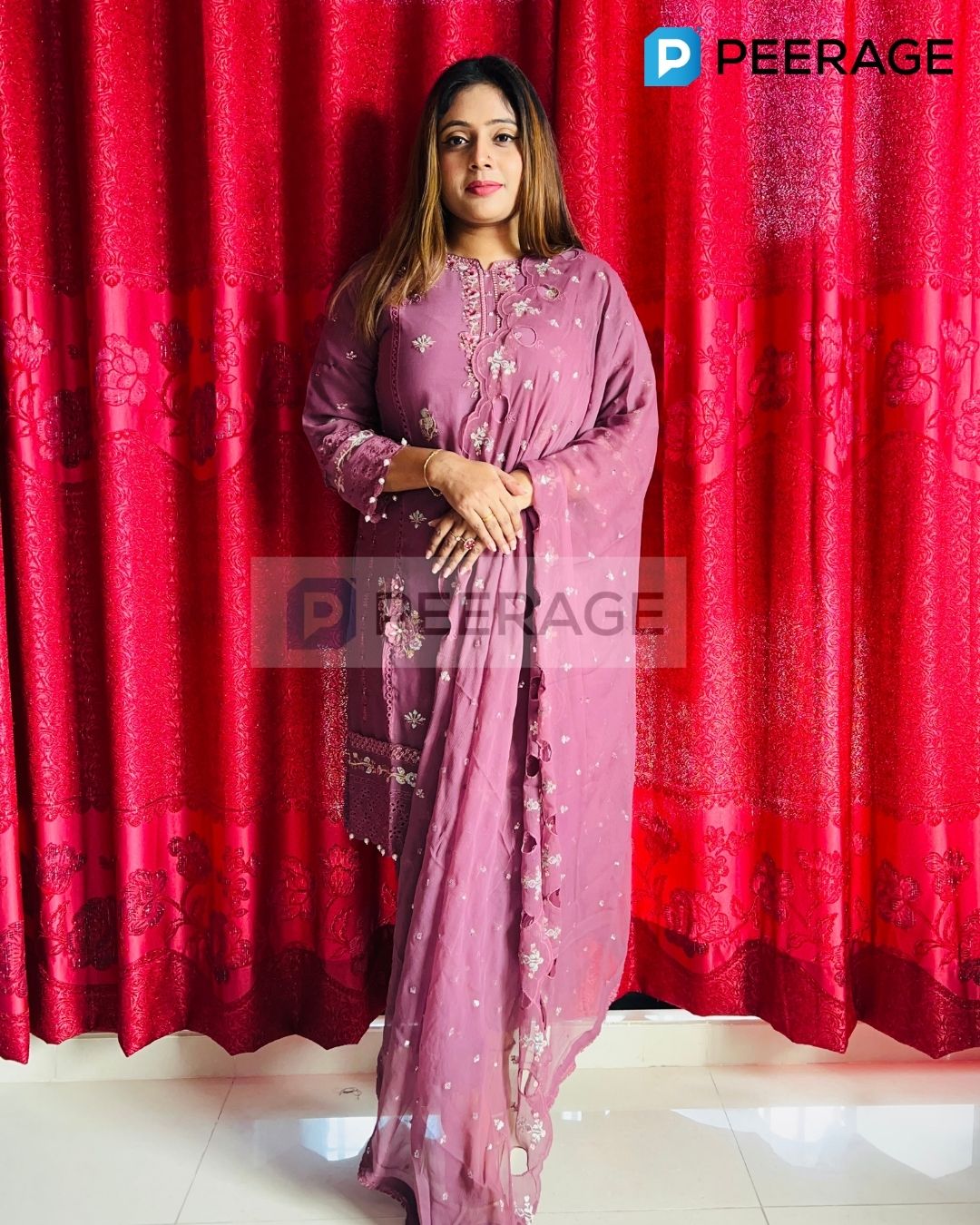Embrace elegance in this mauve chiffon outfit, featuring an embroidered stitched chiffon kameez with santoon inner, a flowy chiffon dupatta, and a santoon pant. A delicate and timeless ensemble, perfect for adding charm to your special moments.