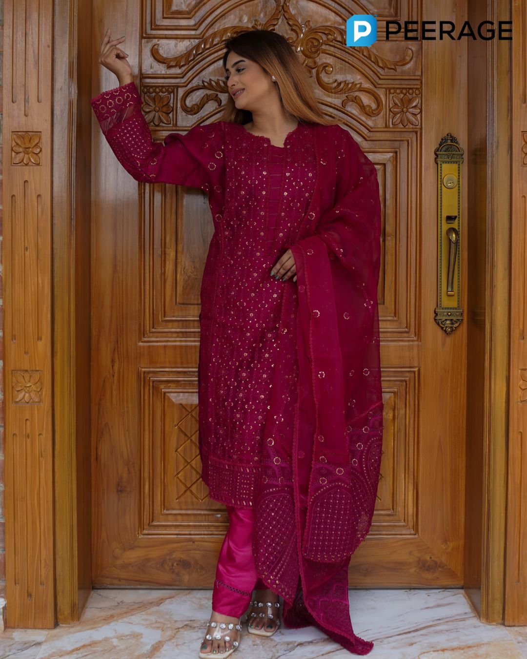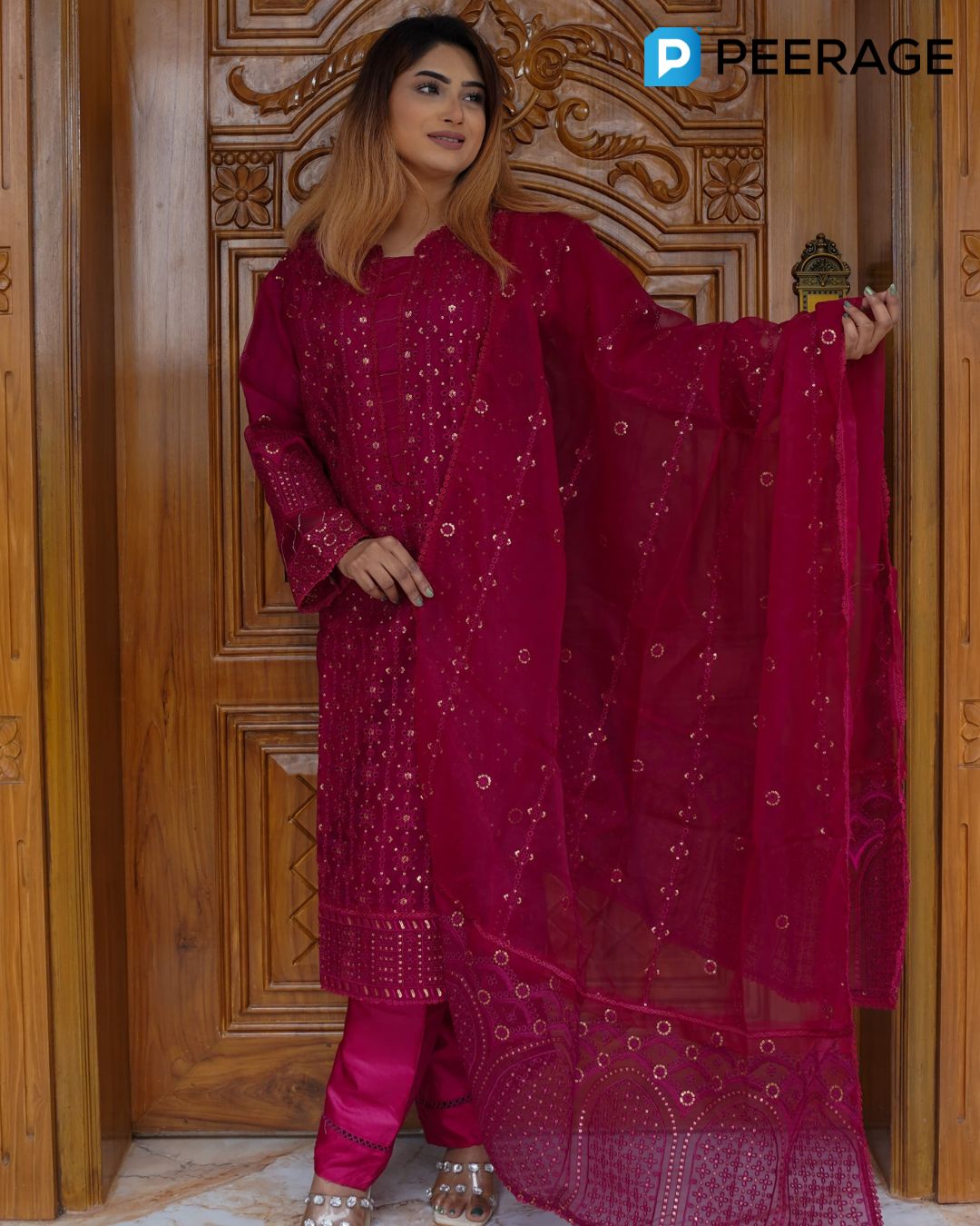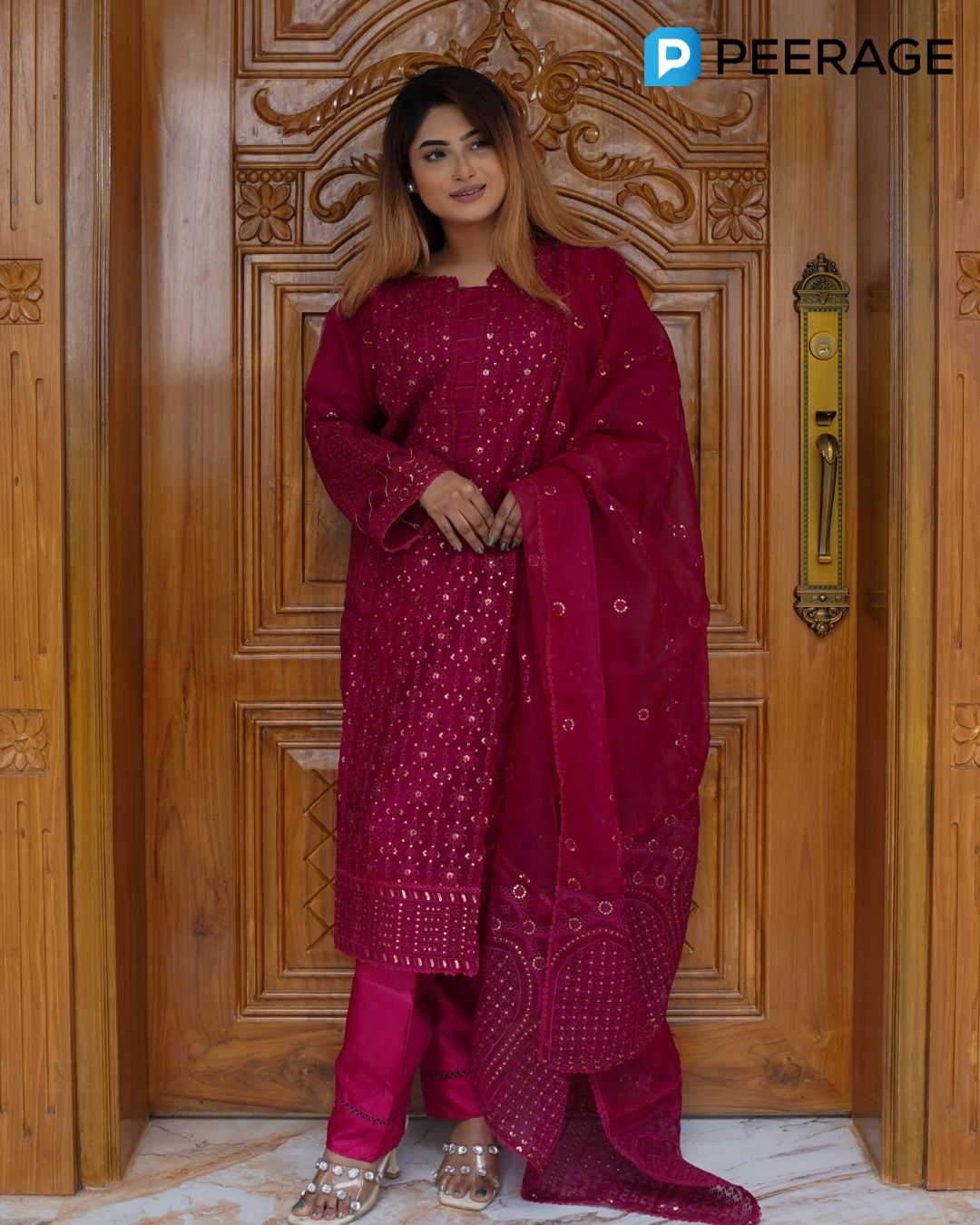 Exude timeless grace with this maroon organza ensemble, featuring a stitched organza kameez with santoon inner, paired with a flowy organza dupatta and santoon pant. A perfect blend of sophistication and festive charm, designed to make every occasion special.