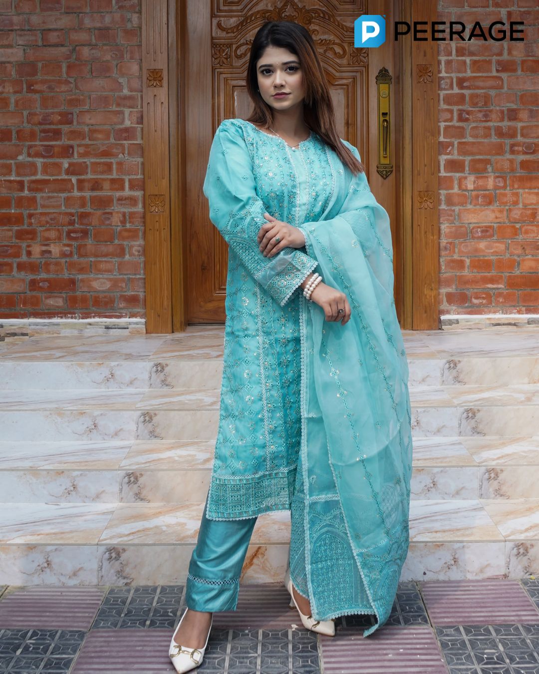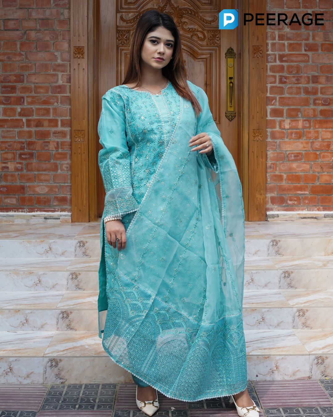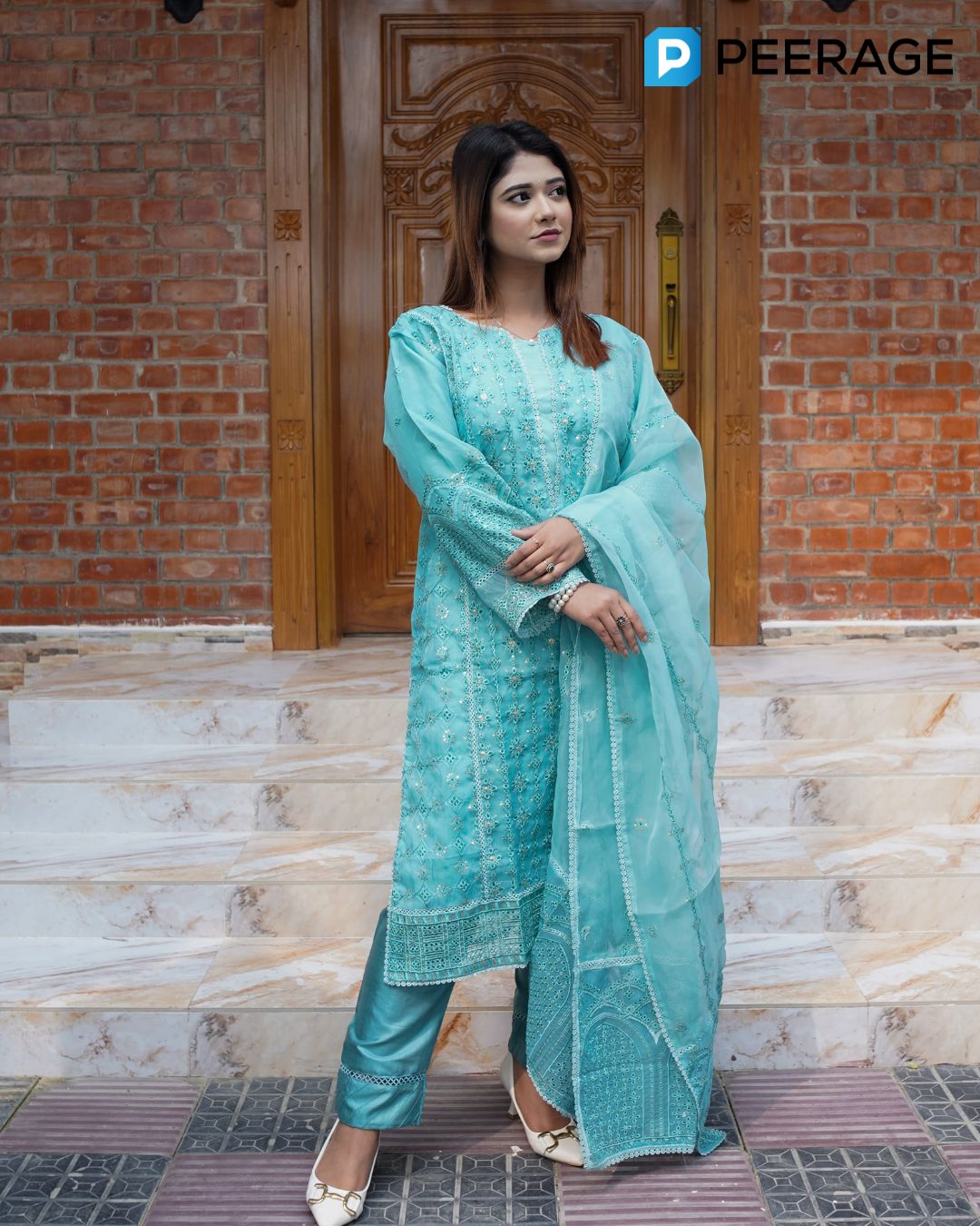 Exude timeless grace with this  organza ensemble, featuring a stitched organza kameez with santoon inner, paired with a flowy organza dupatta and santoon pant. A perfect blend of sophistication and festive charm, designed to make every occasion special.