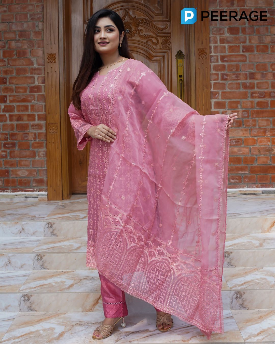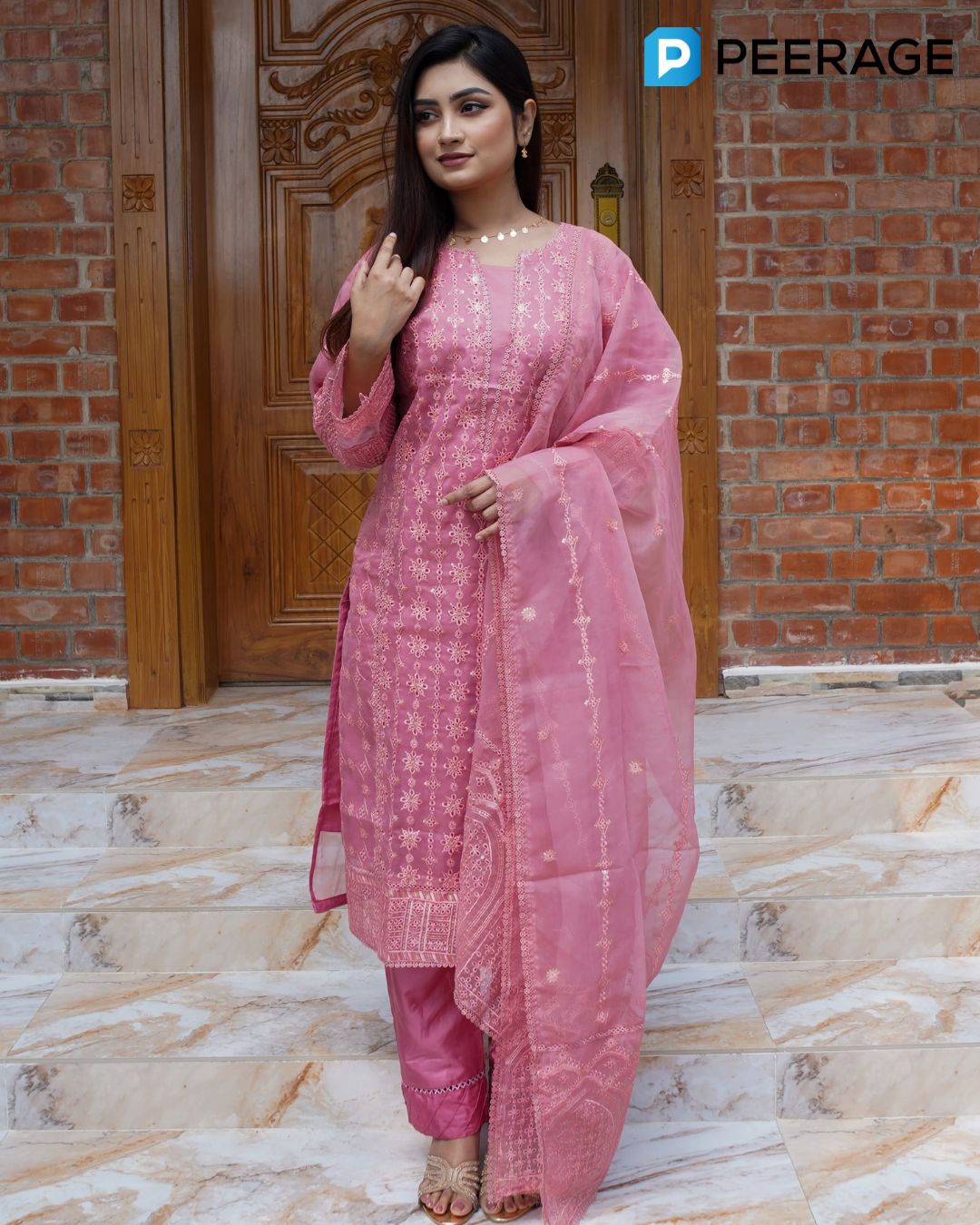 Exude timeless grace with this peach organza ensemble, featuring a stitched organza kameez with santoon inner, paired with a flowy organza dupatta and santoon pant. A perfect blend of sophistication and festive charm, designed to make every occasion special.