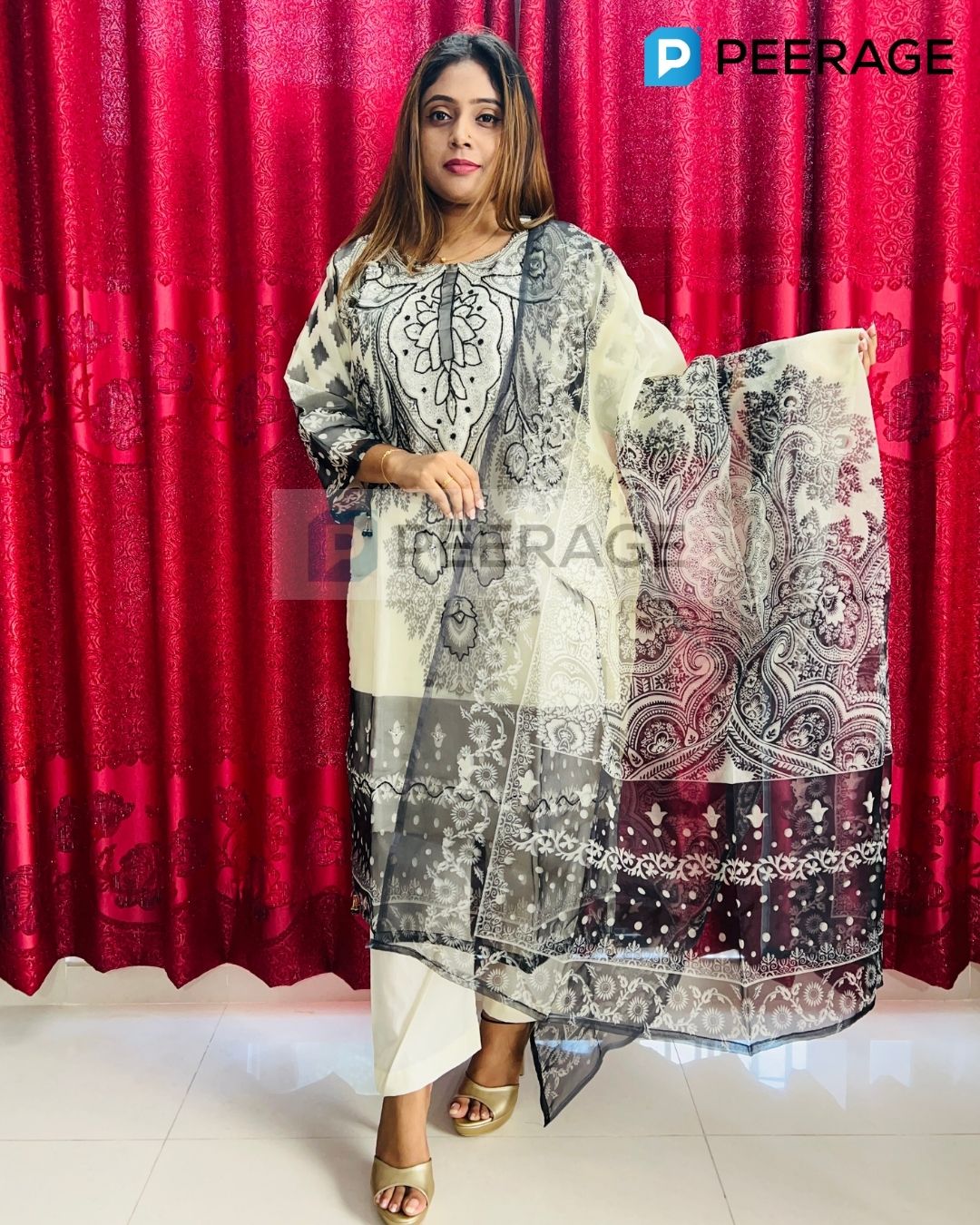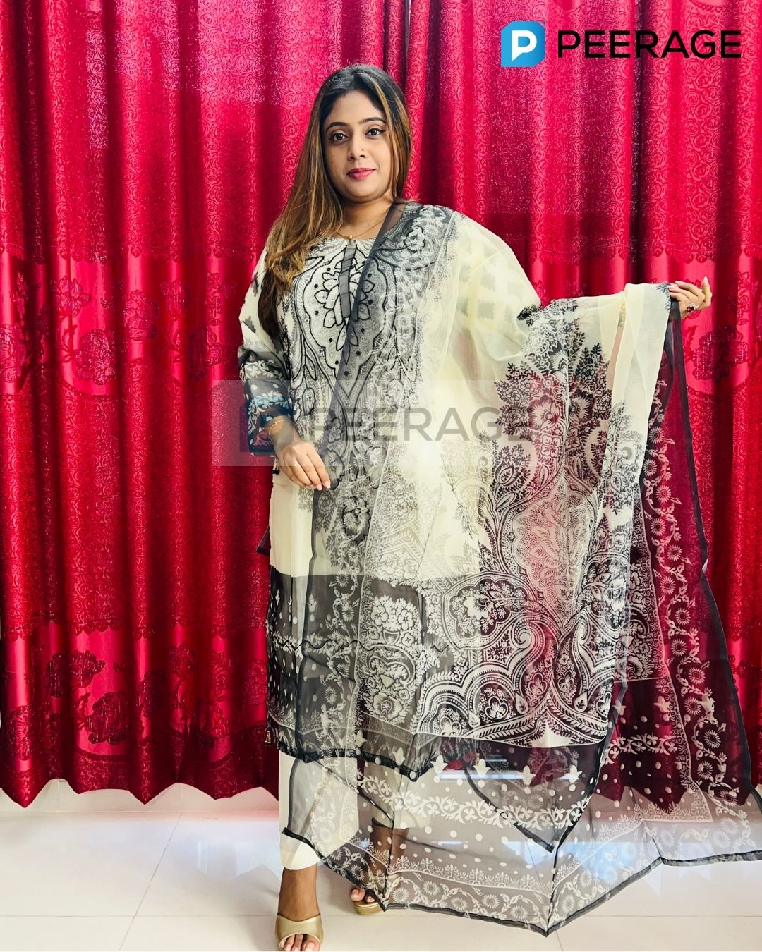 Shine with sophistication in this off white & black tissue ensemble, exquisitely designed with crystal beads, delicate pipework, and tassel detailing. Paired with a santoon inner, matching tissue dupatta, and santoon pant, this outfit is the perfect blend of luxury and timeless elegance—crafted to make every occasion special.
